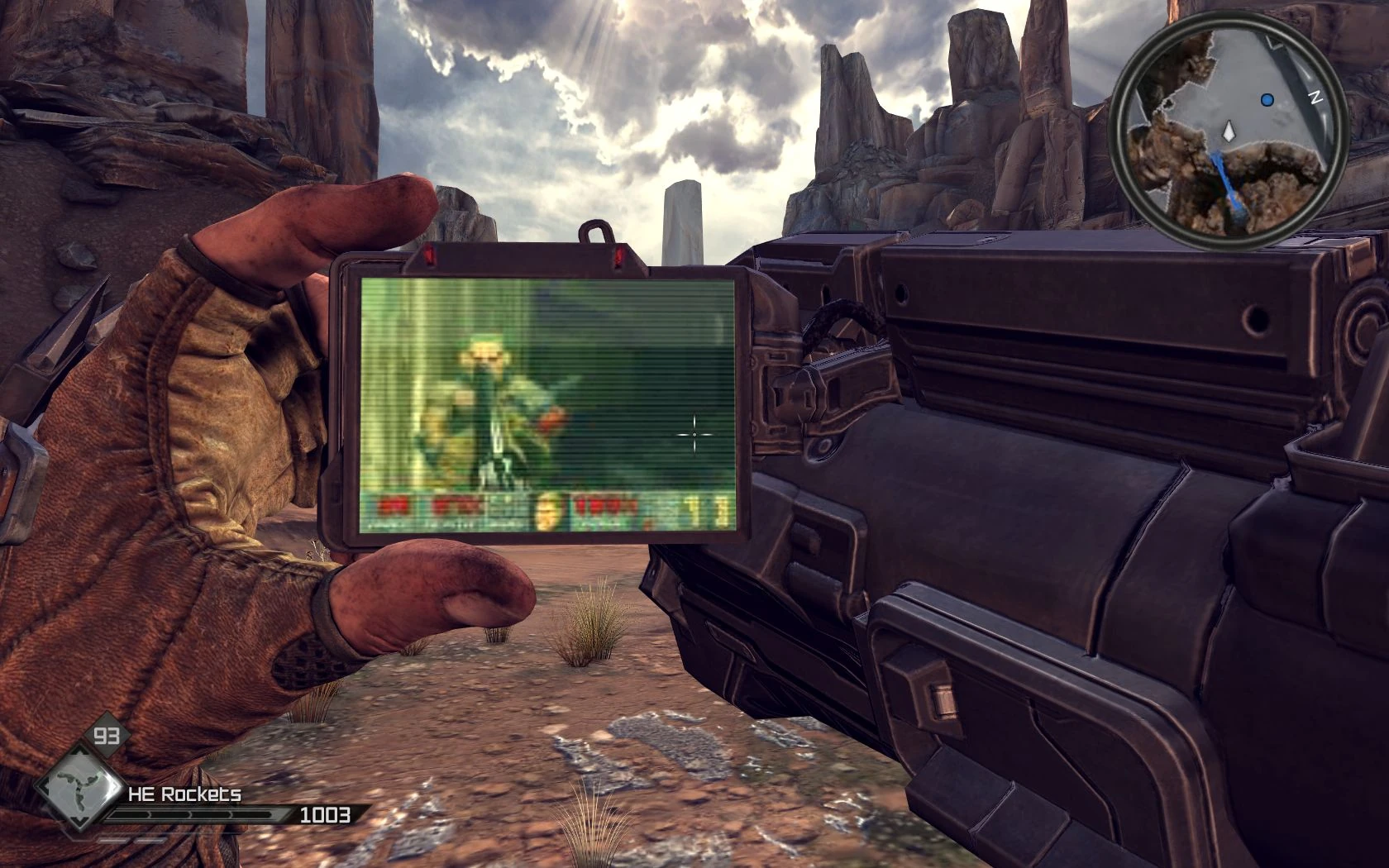 While having the Rocket Launcher equipped and standing in one spot doing absolutely nothing for about five minutes, the targeting screen will flip down and a game of Doom will be playing.