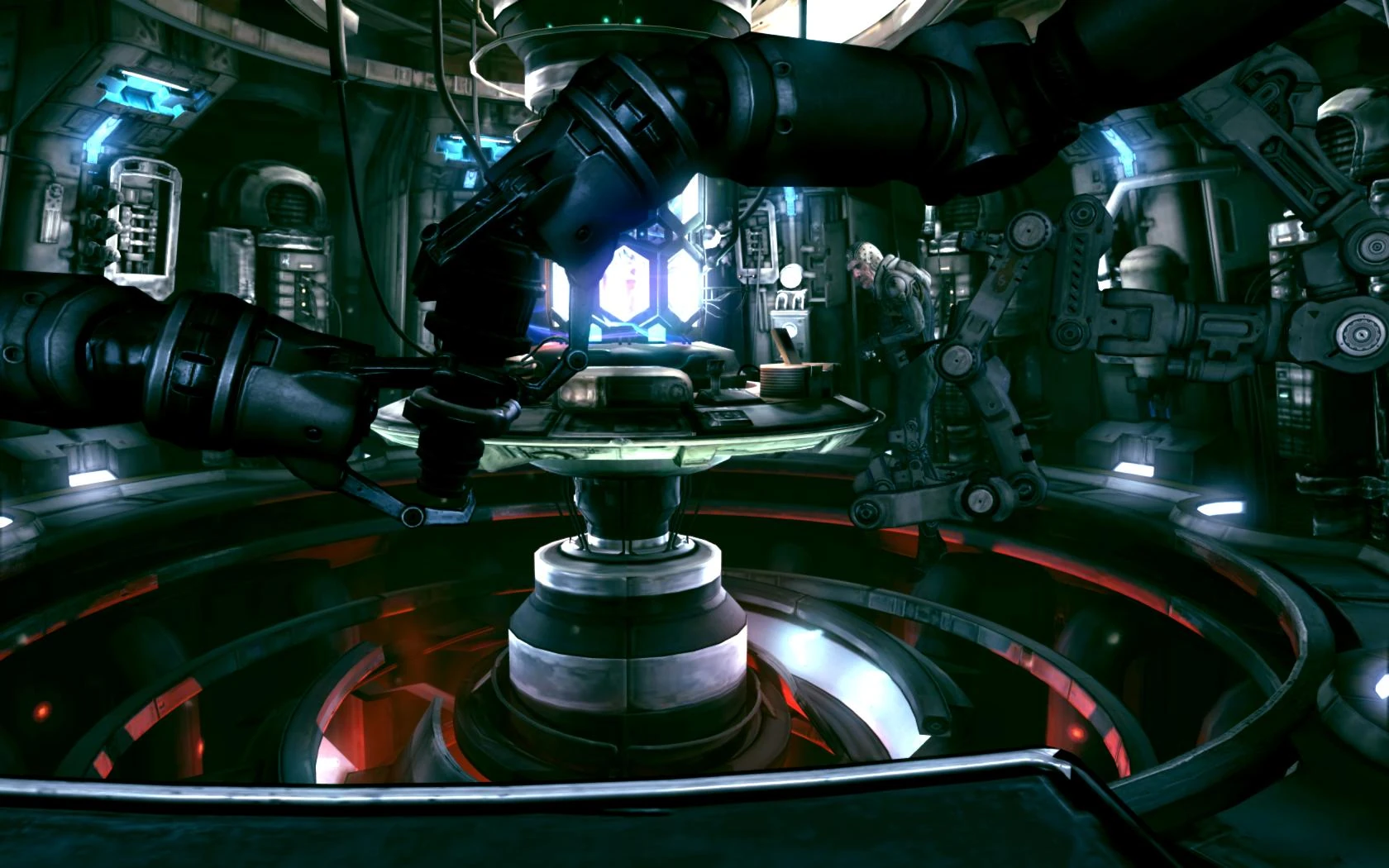 In this video clip from Dr. Kvasir's lab (RAGE), you can see the animation that occurs when the mechanical arms retrieve the item from the table. The left arm will attempt to grab the item from the right arm's grasp, a slight struggle will ensue, but the right arm will always retrieve the item for the doctor. The left arm will drop itself downward as if to express sorrow at its own defeat. This is an unconfirmed reference, but the similar animations make this an extremely likely nod by the animators to a favorite moment from The Darkness.