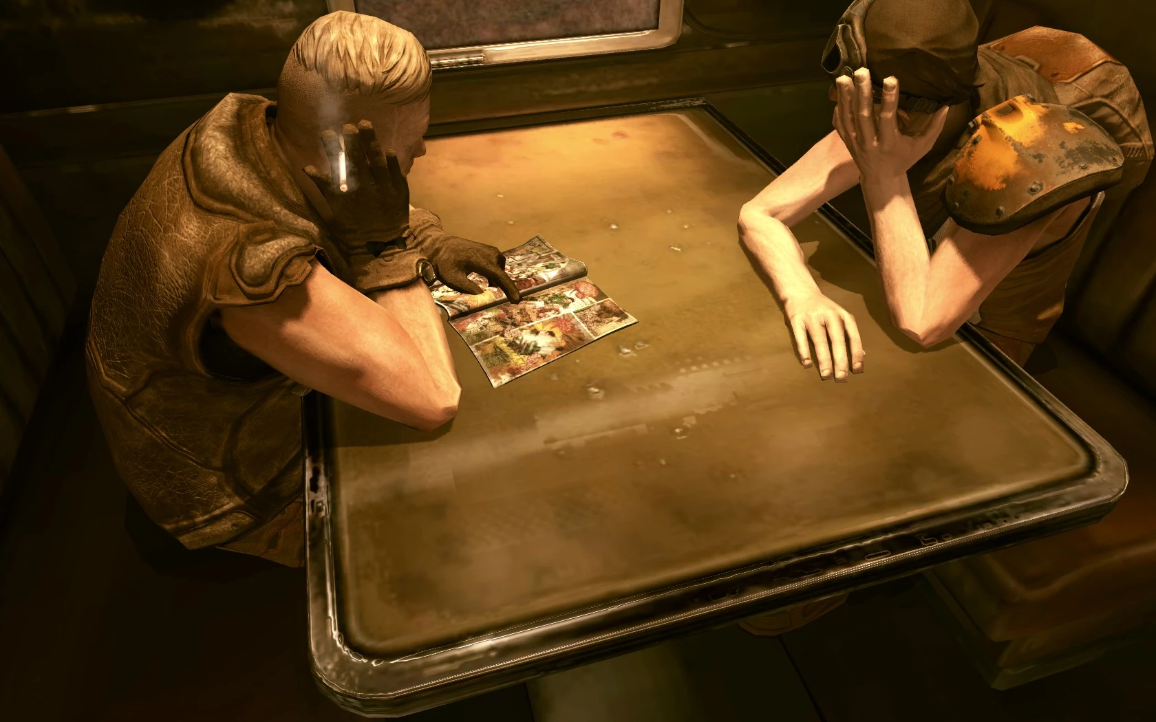 In Subway Town, the picture in the magazine Dietrich is reading is the mushroom cloud freeze scene seen at the end of Fallout: A Post-Nuclear Role-Playing Game game with the tag line "War, war never changes". The player can also see the explosion and an Enclave eyebot and the surrounding area is faint.