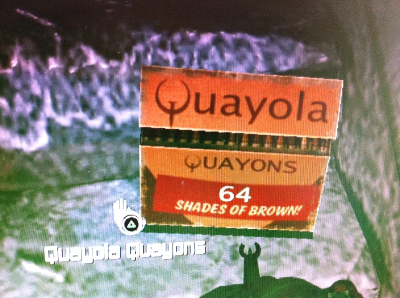 Inarguably a reference to the criticism that Quake featured too many brown tones, a box of "Quayola" crayons can be found and collected in the game. This critique was referenced by Ben "Yahtzee" Croshaw in his Zero Punctuation review video of Clive Barker's Jericho, claiming: "id software's original Quake […]. I'm sure with the benefit of hindsight we can all agree that Quake wasn't exactly easy on the eye. Which was your favorite Quake level? The brown castle, the greenish brown temple or the other brown castle?" The name itself is a reference to "Crayola" brand crayons.