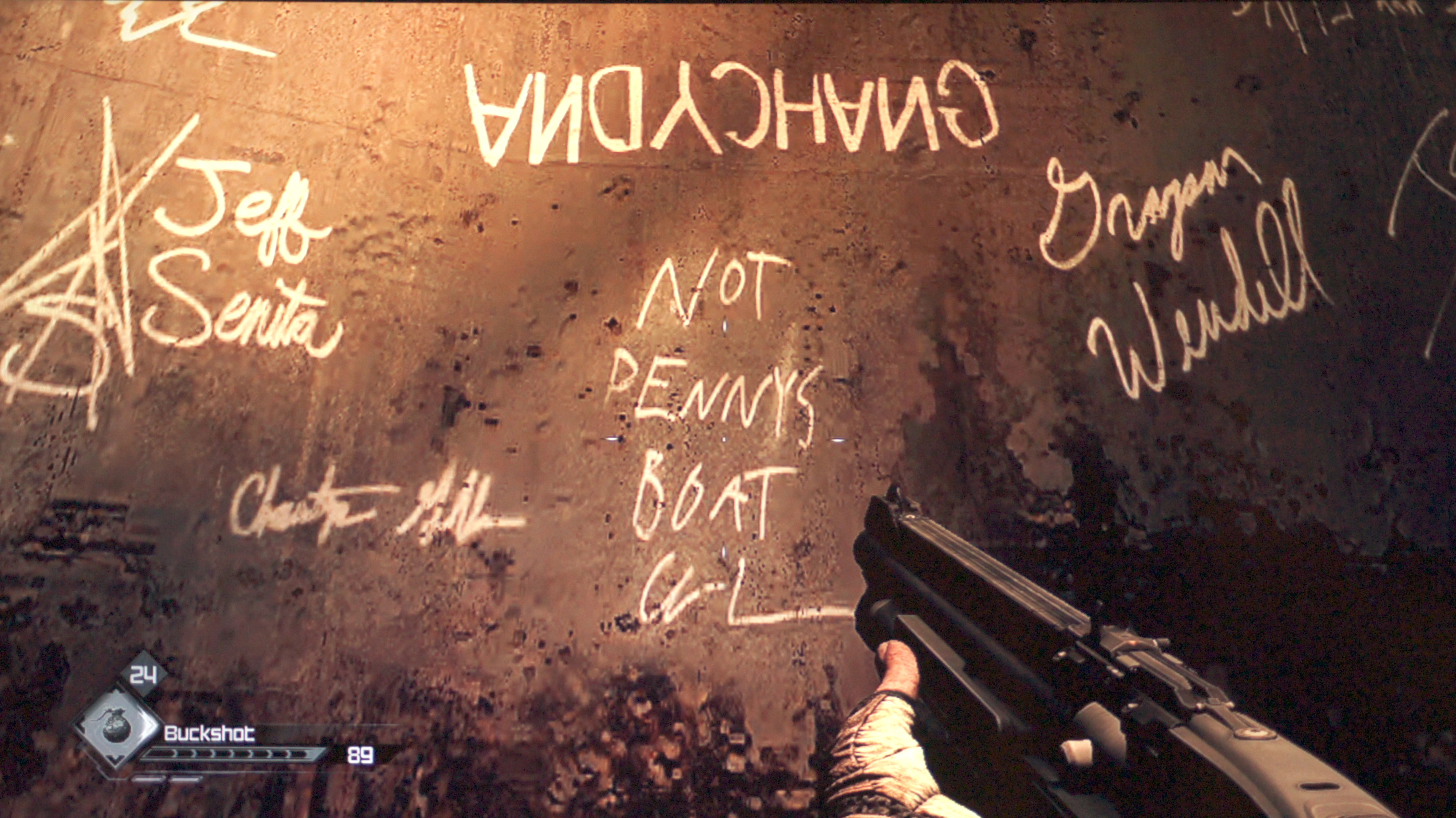 Note that an autograph from "Cacodemon" can be found among the various graffiti within this room. This is referencing the Cacodemon monster from the Doom series.